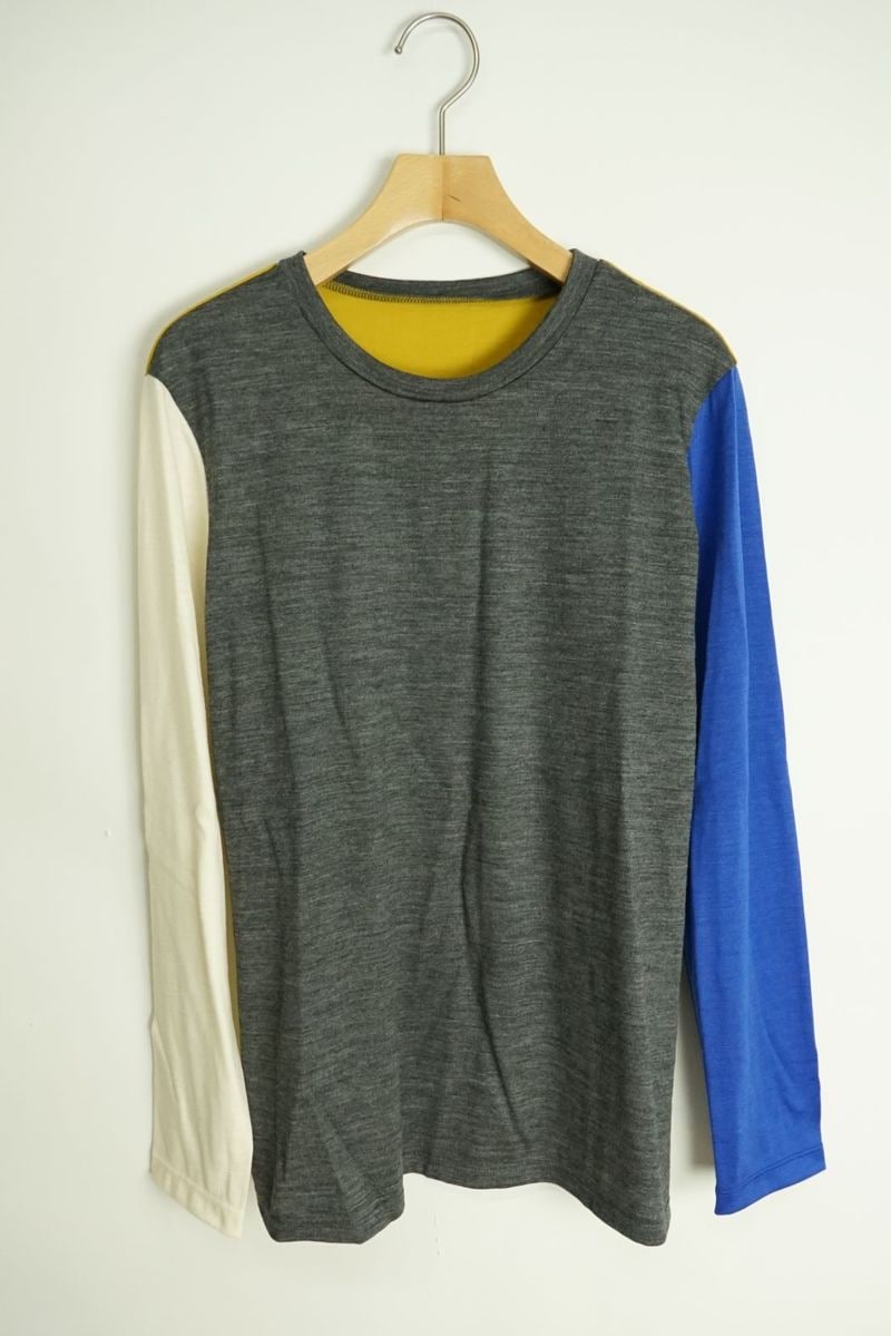 ウール天竺抗ピル加工 ブロッキング配色長袖Tシャツ
