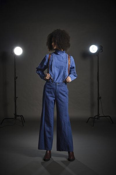 コットンリネンダンガリー スタンドカラーフリルブラウス