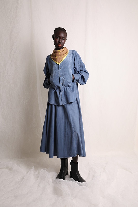 様々な異素材をミックスしたり、製品染めで独特な風合いを醸し出すなど、デザイン性の高さに優れたブラウス。