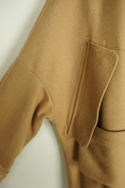 従来のウールと比較して30%軽量し、柔らかさと保温性に優れた特殊素材である「カール・カール」を使用しています。大きな身幅のボックスシルエットになっており、中には薄手のシンサレート中綿を挟み暖かな1枚。裾には紐が内蔵され、ドローストリングして窄まることが可能です。