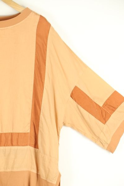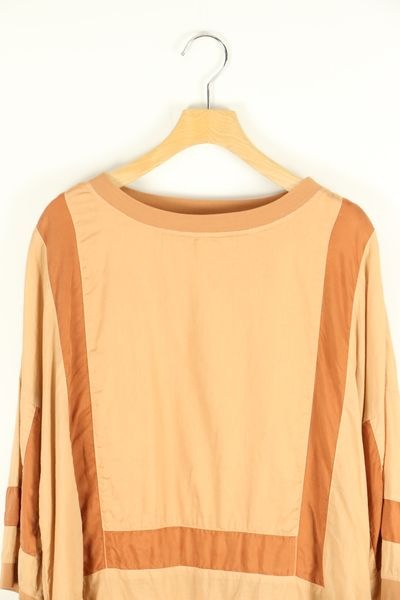 四角形の切り替えが全体に大胆に入ったかぶりブラウス。