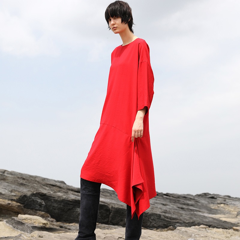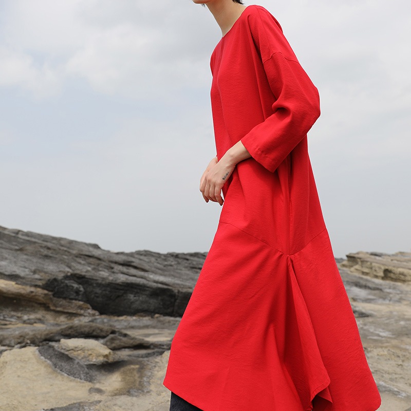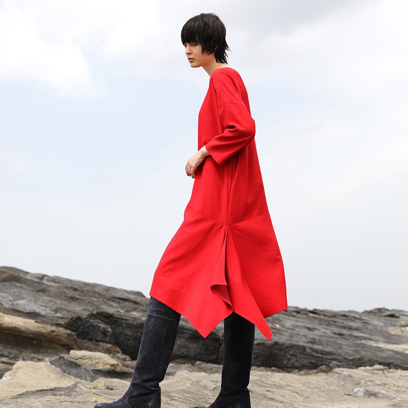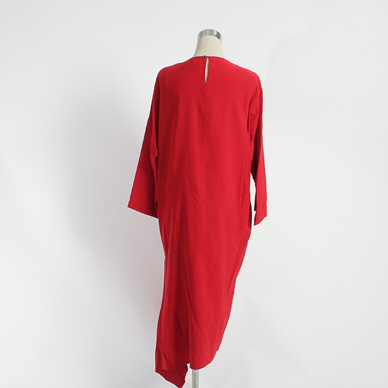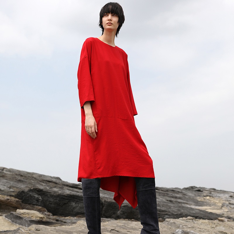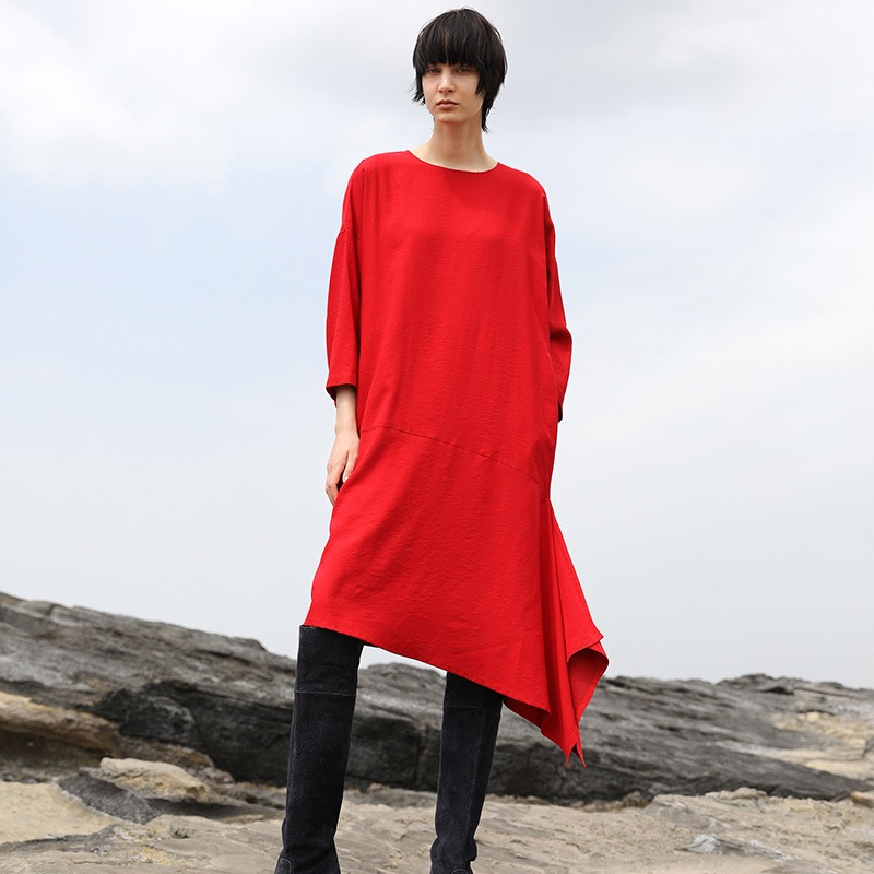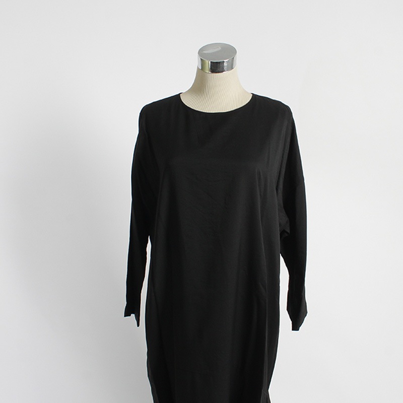 ゆったりとしたシルエットのノーカラーかぶりワンピース。