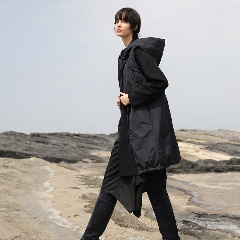 身頃には裾に向かって斜めに切替が入り、左脇裾にドレープが生まれ、動きのある裾ラインとなっています。