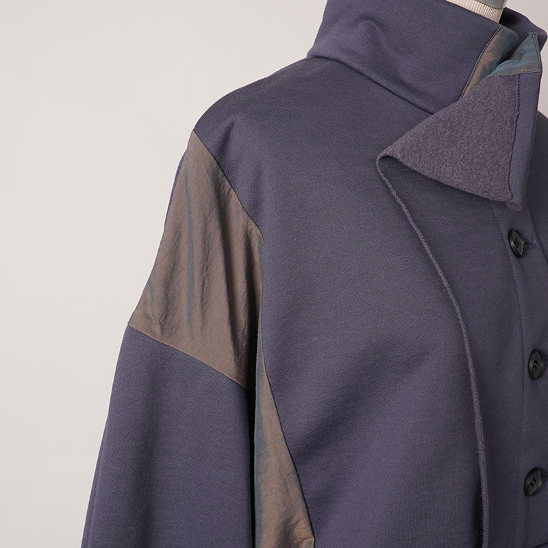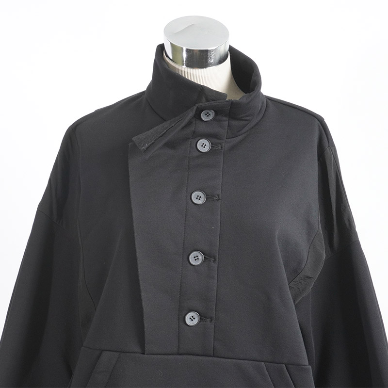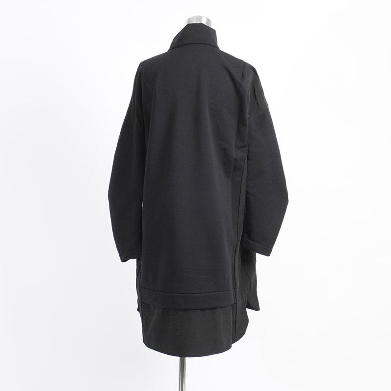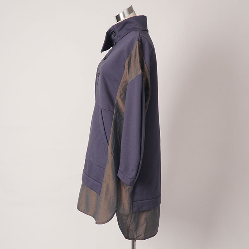 膝位の前後差のある着丈、ゆとりのある身巾で、ドロップショルダーにカーブした長袖が付き、シャツテールとなっています。