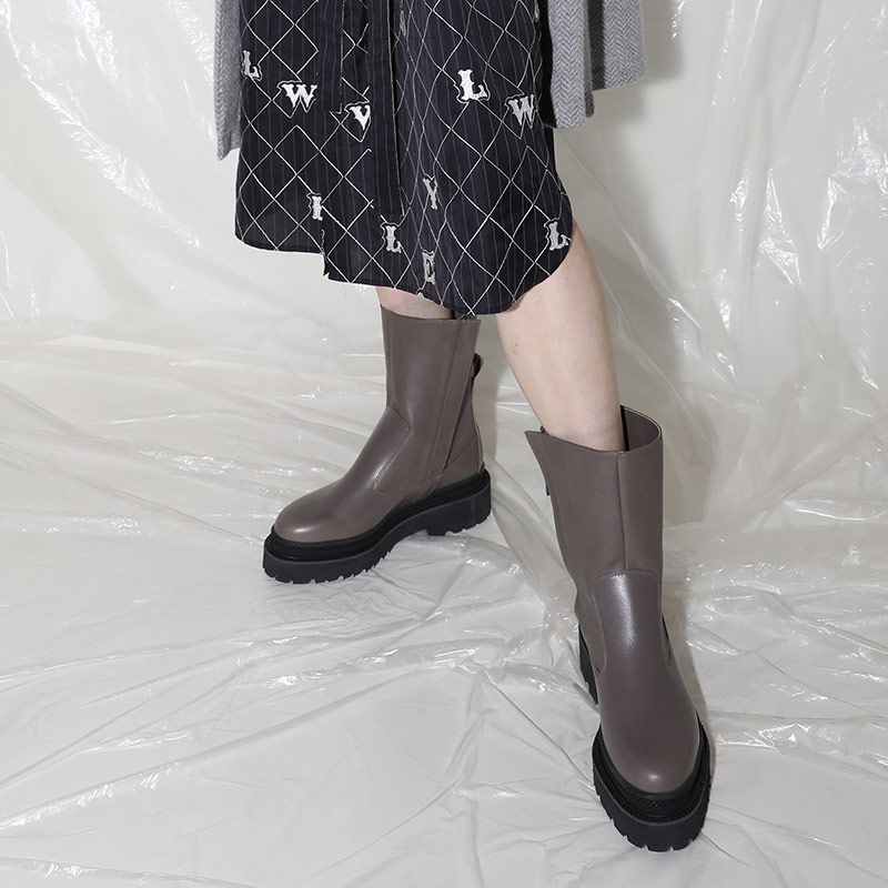 ステッチ入りの厚底二重ソールはメンズライクな見た目ですが、全体を軽い素材で仕上げ、足への負担を軽減しています。
