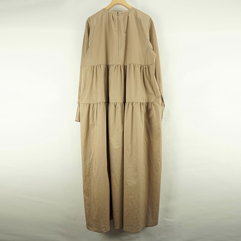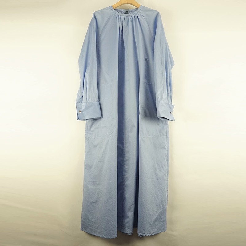 フルレングス丈のかぶりノーカラーロングワンピース。