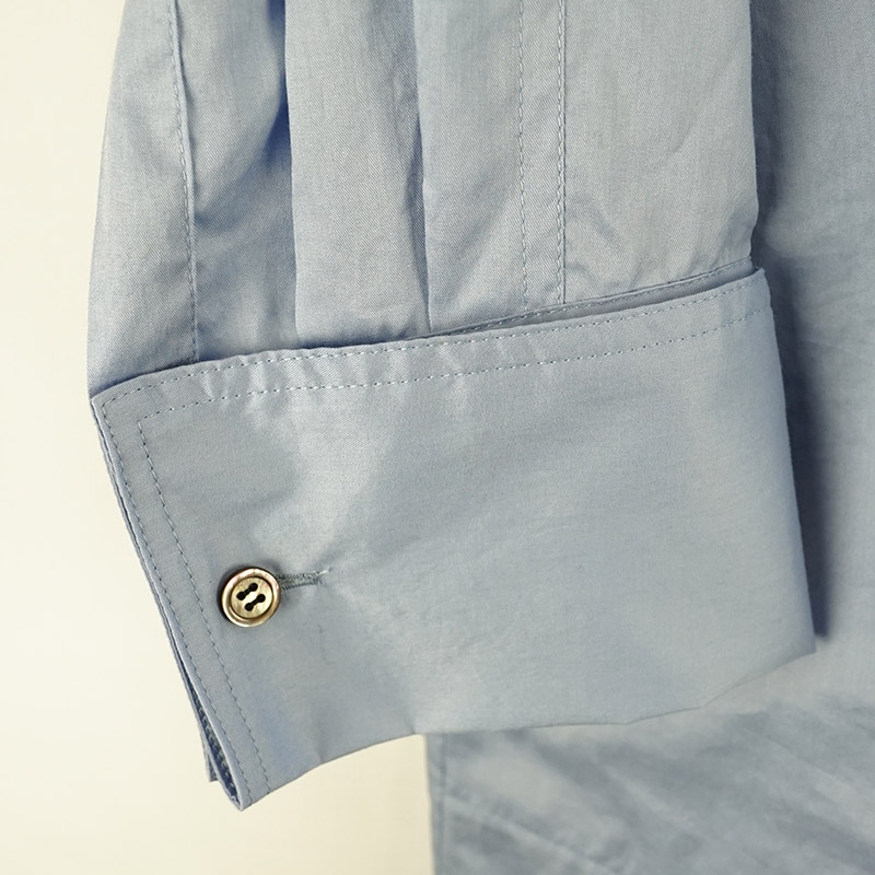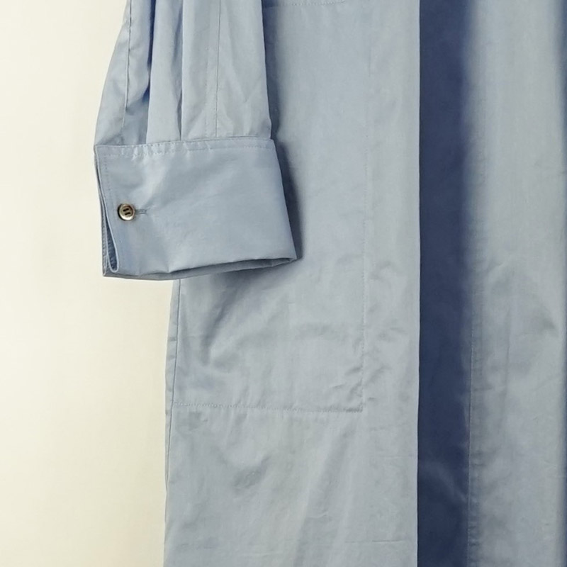 ノーカラー、Aラインシルエット、前後衿ぐりからギャザーの入ったゆとりのある身巾、ラグランスリーブ、ダブルカフスの長袖です。