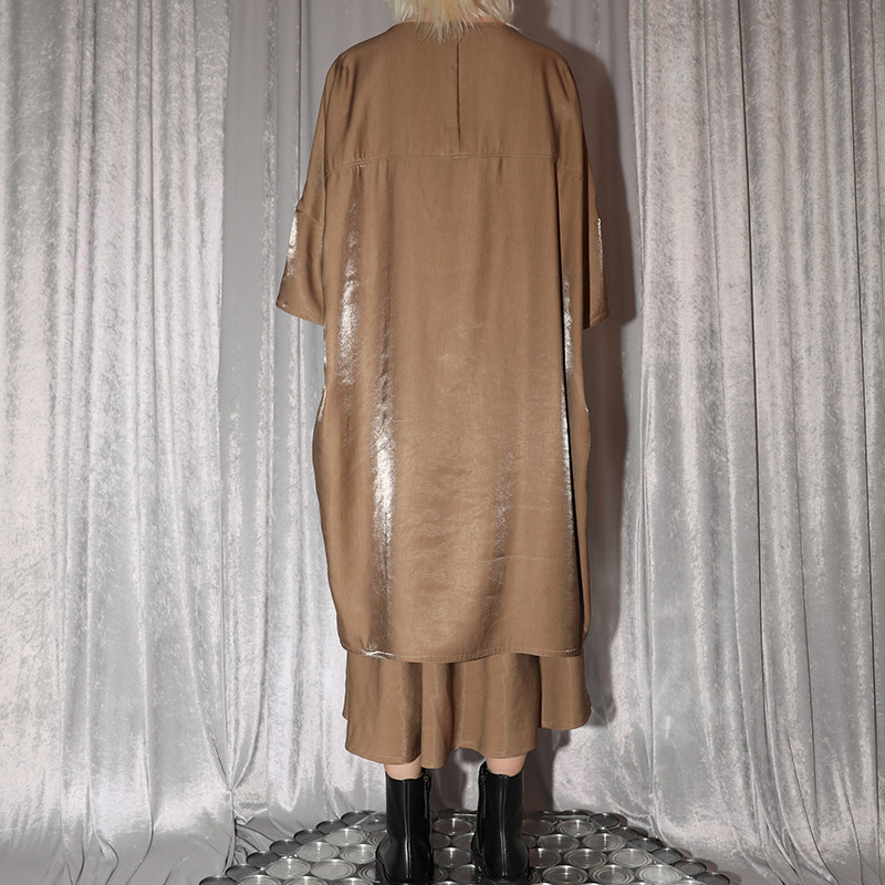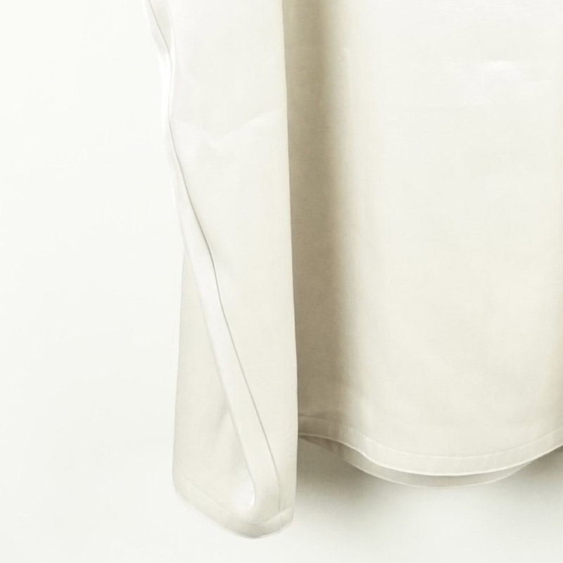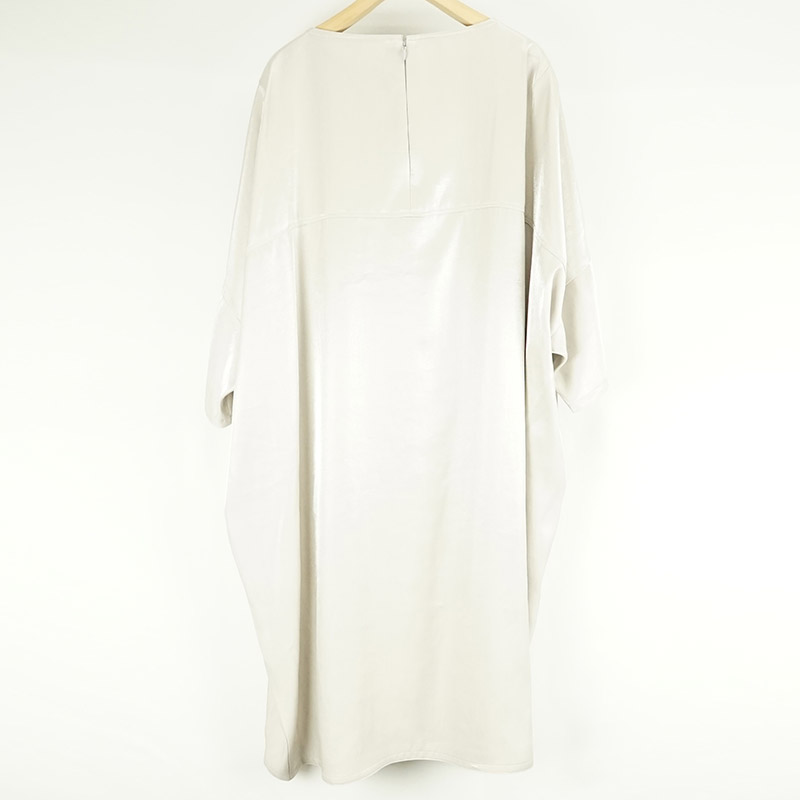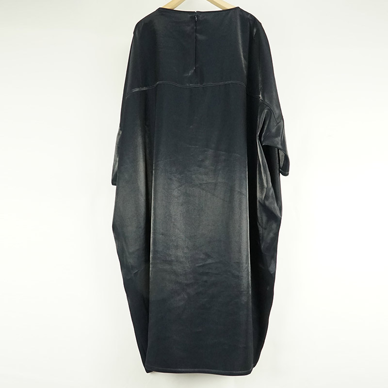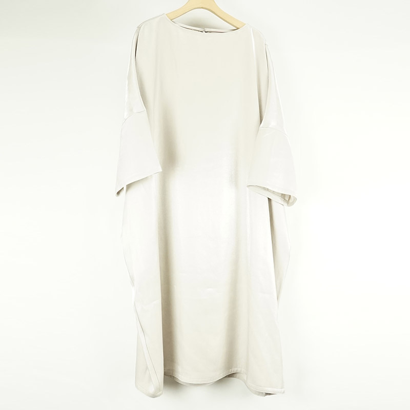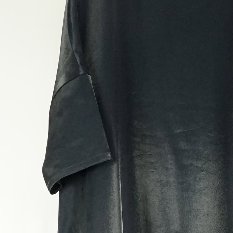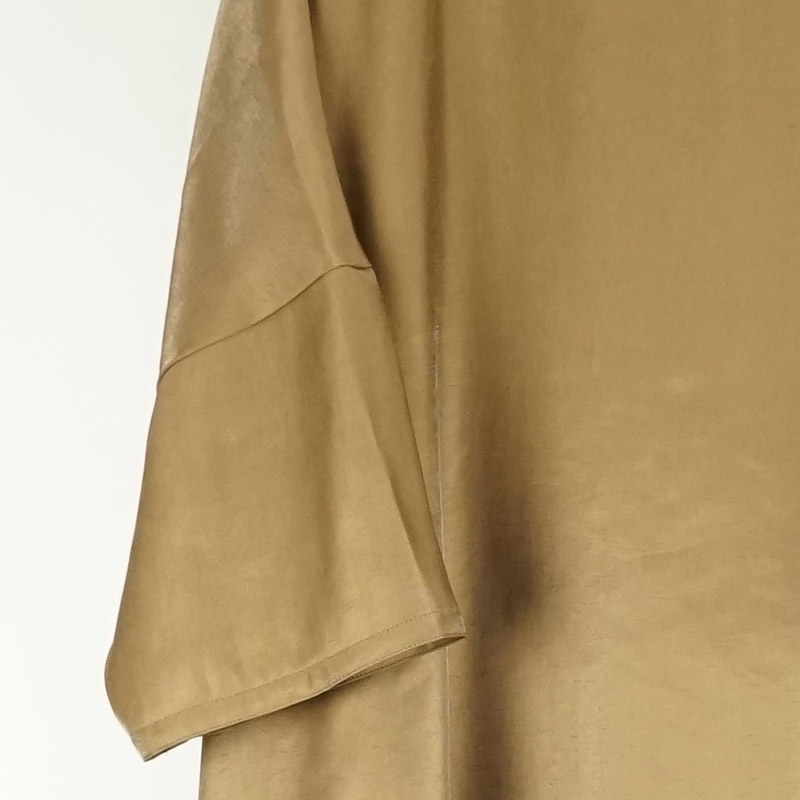 しなやかに自然なドレープがあり、ゆったりとしたドロップショルダー、膝の隠れる位の着丈、7~8分位の袖丈です。