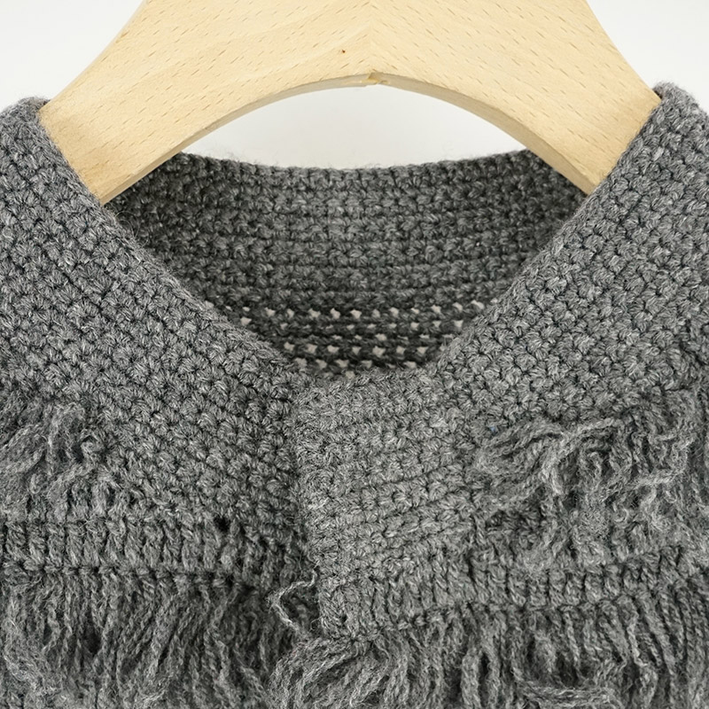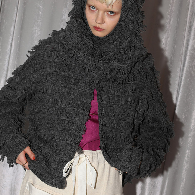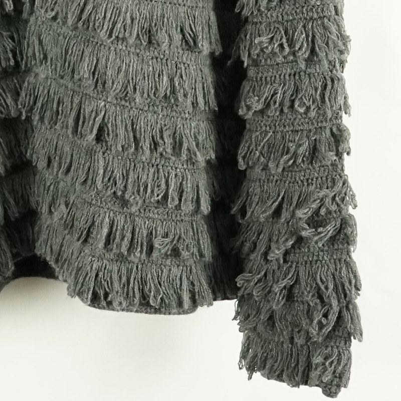 かぎ針手編みで丁寧にループ編みしたクルーネックスナップ開きニットカーディガン。