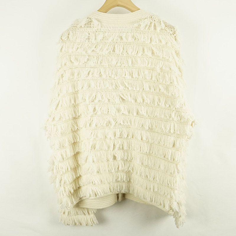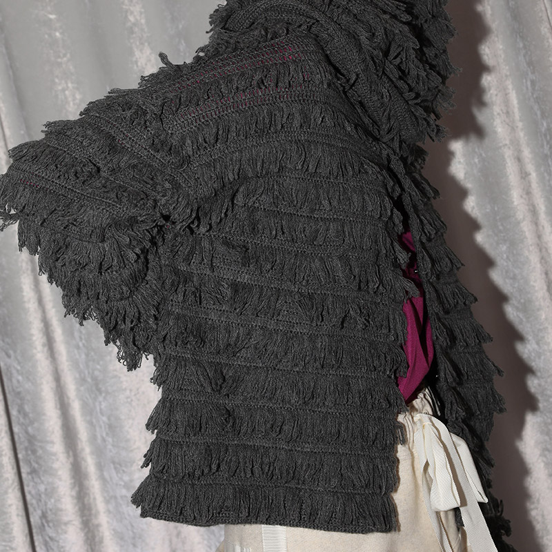 素材には、カシミヤ100%のタッチに近づけた、毛が細く密度が高く軽いウール/カシミヤ糸を使用して数本の糸を引き揃えて一枚づつ丁寧にかぎ針手編みしています。