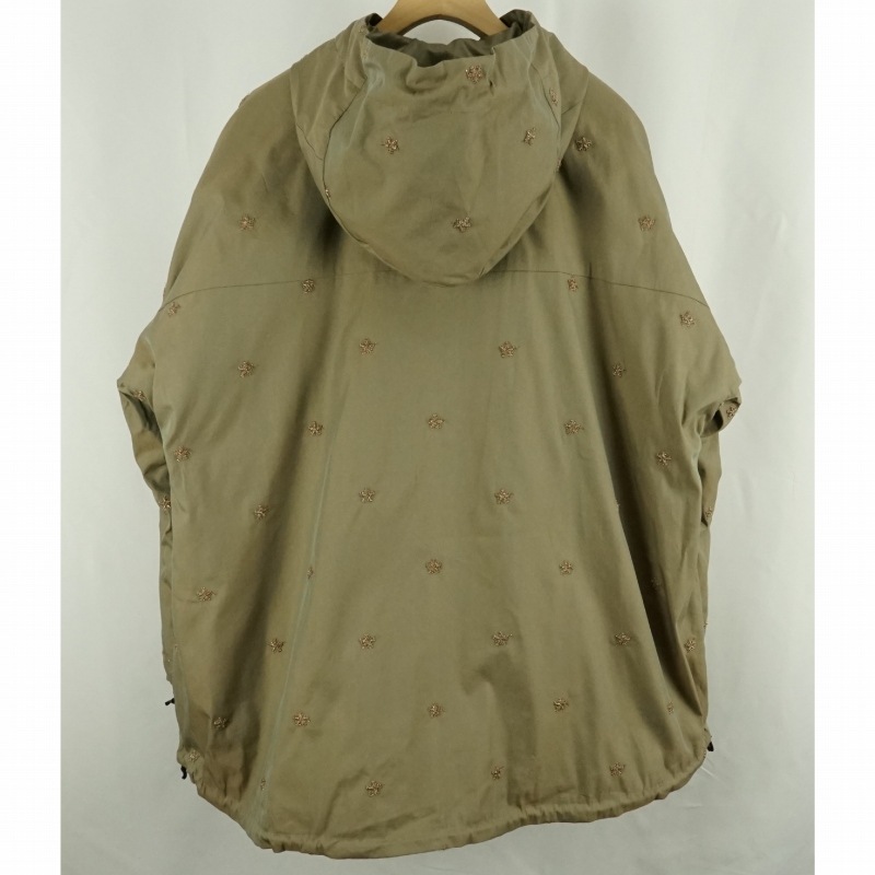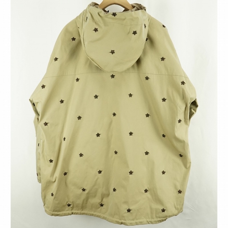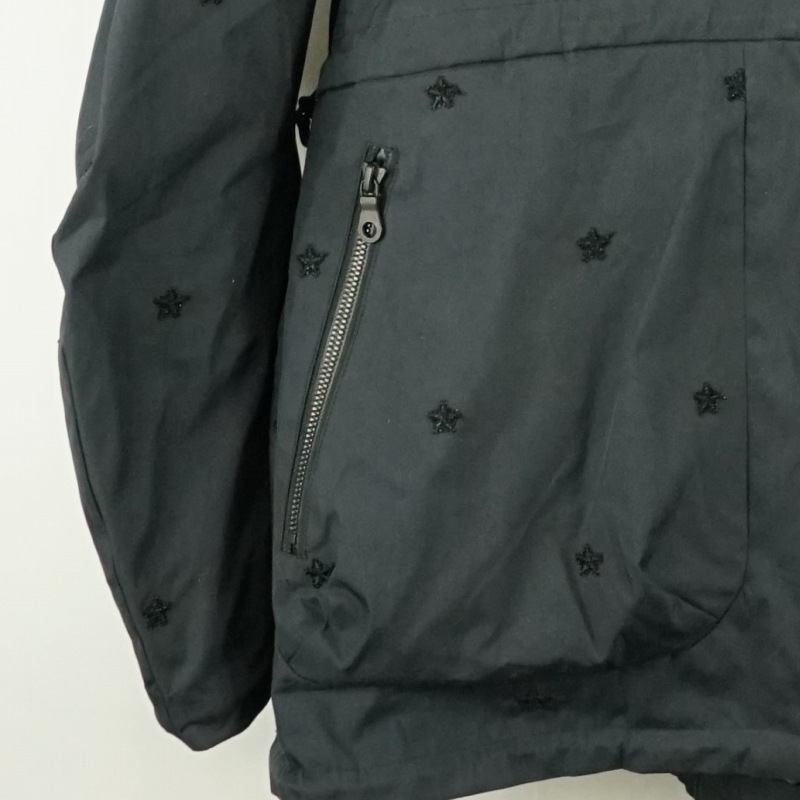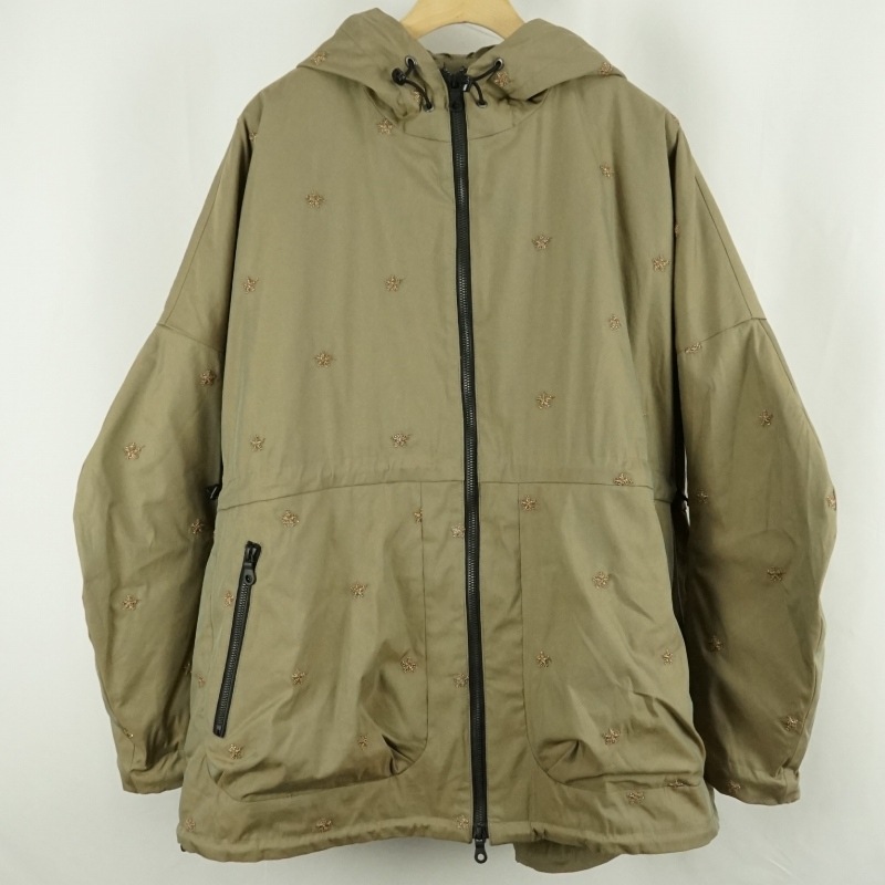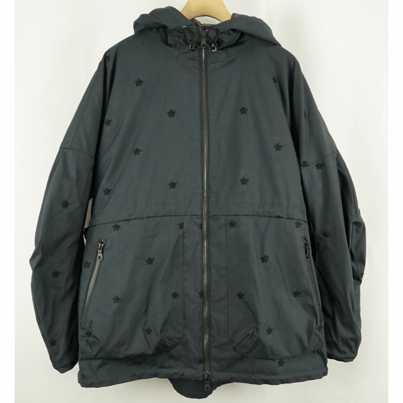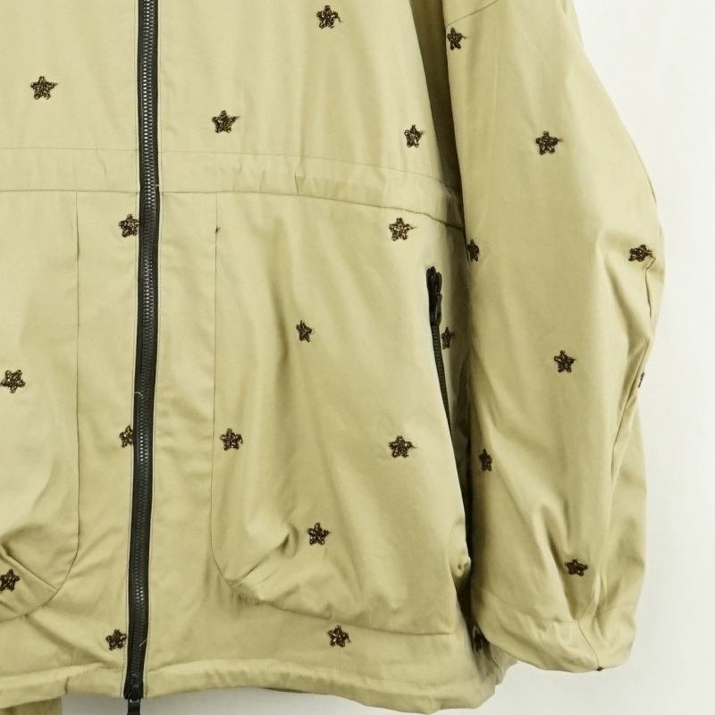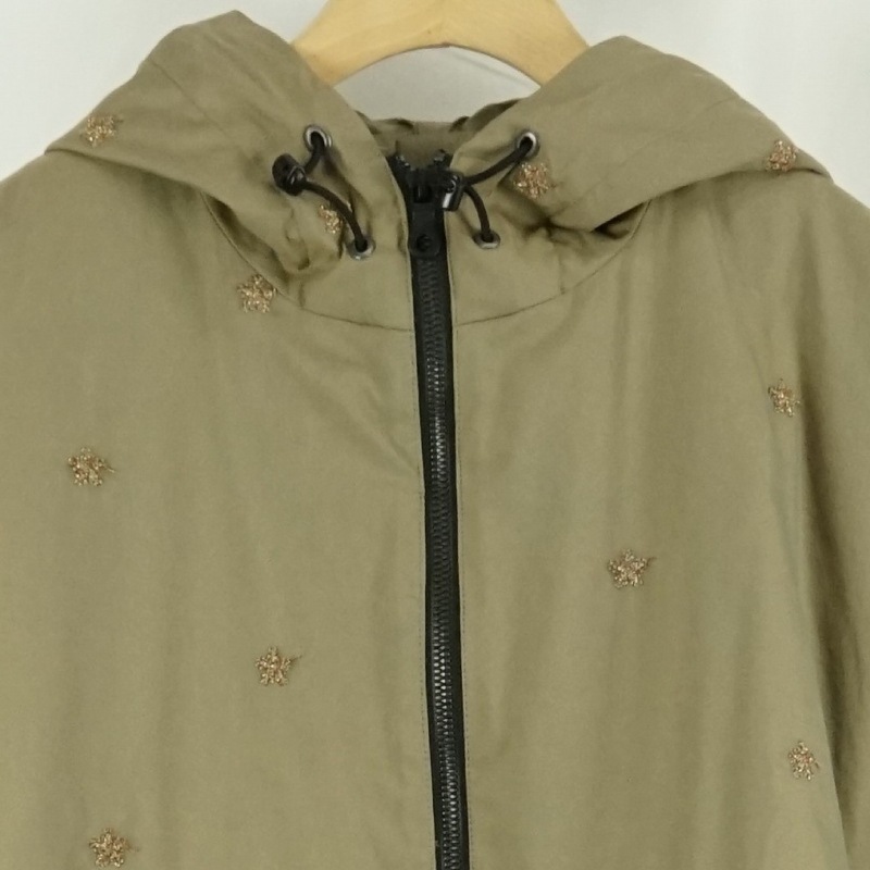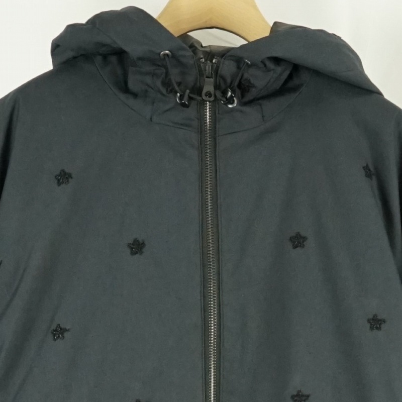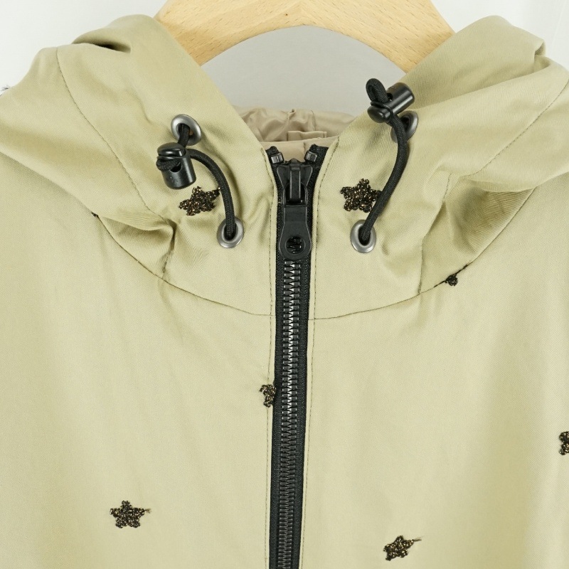 星柄刺繍のノーカラーライナー付きカーブ袖フードブルゾン。