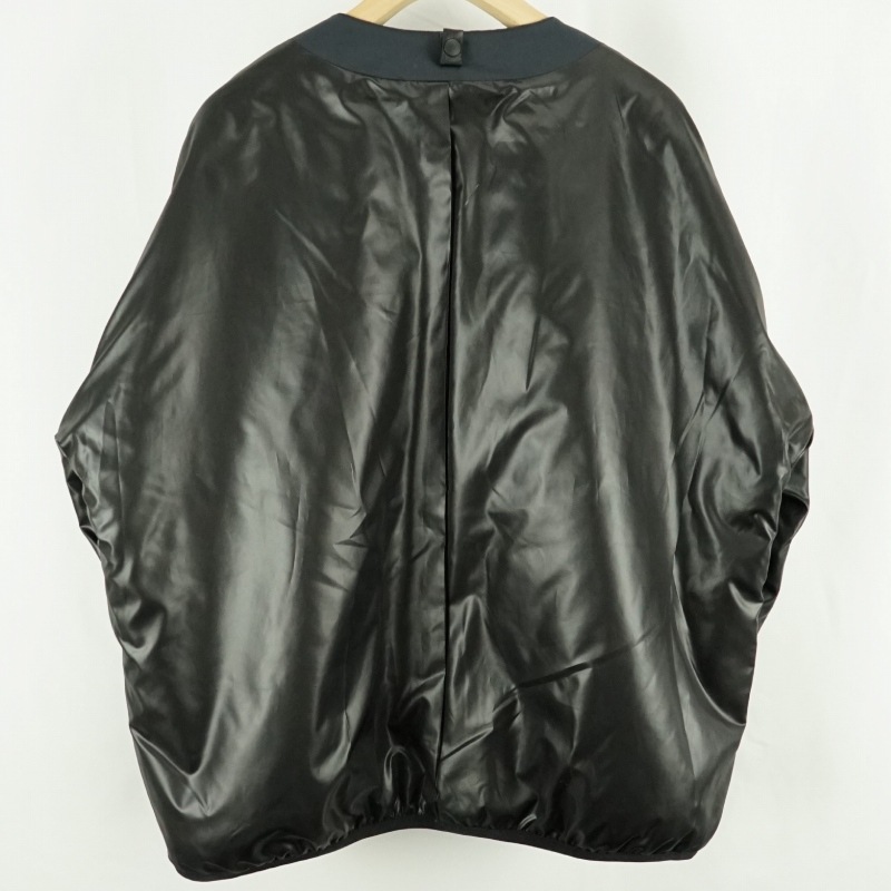 外側のフード付きブルゾンは、ヒップの隠れる着丈で、ゆとりのある身巾には各所にドローストリング紐が付いておりギャザーを寄せて調節ができるようになっています。