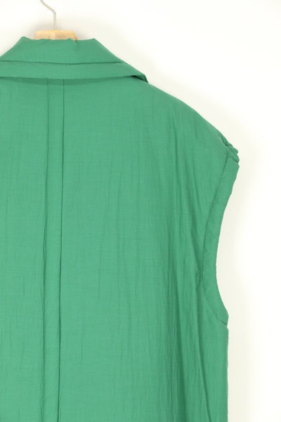 ゆとりのあるシルエット、大きな衿が特徴の軽いベストになります。