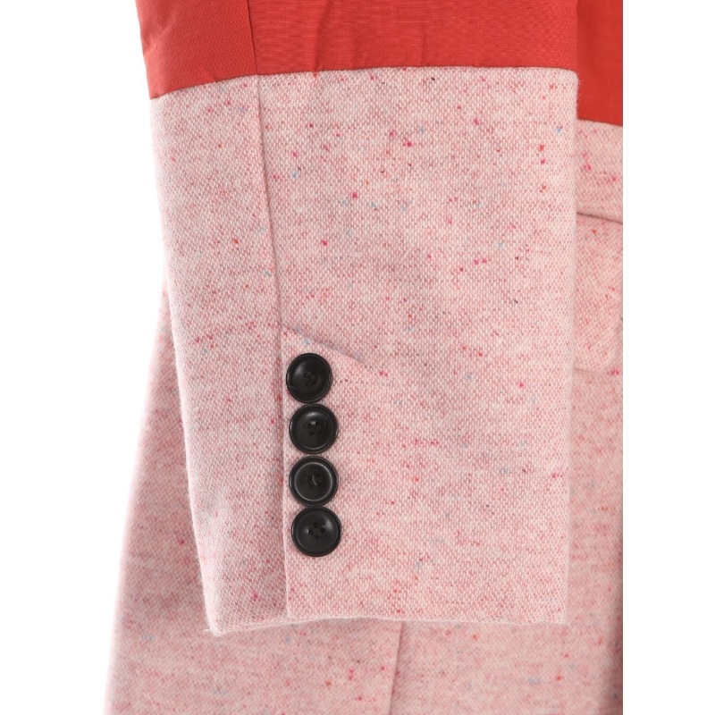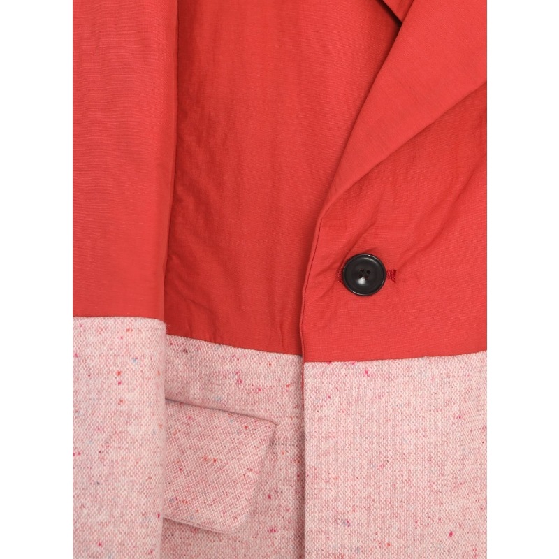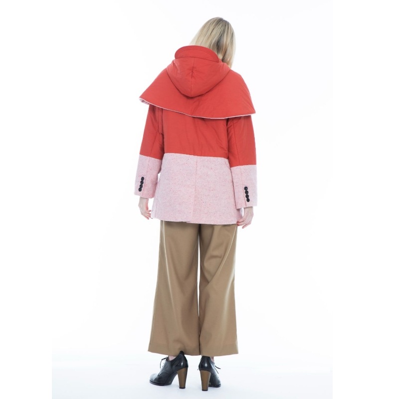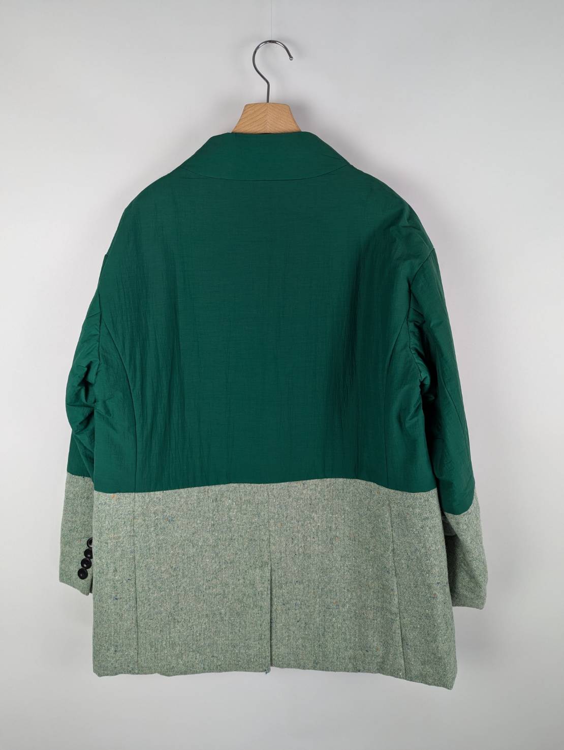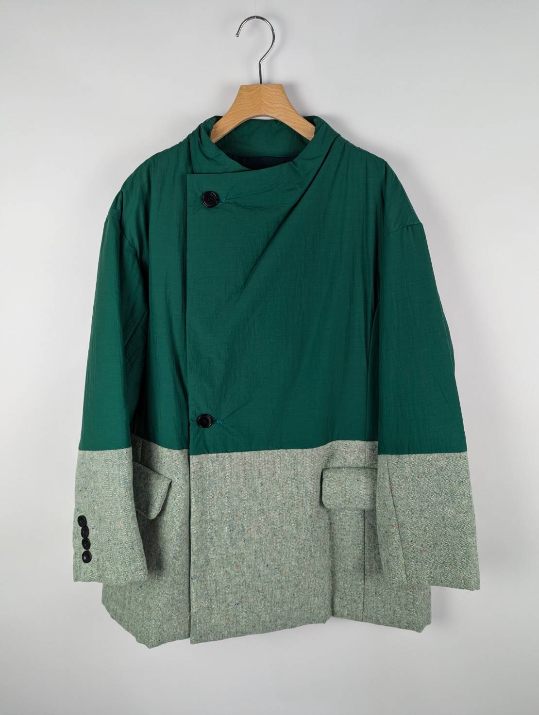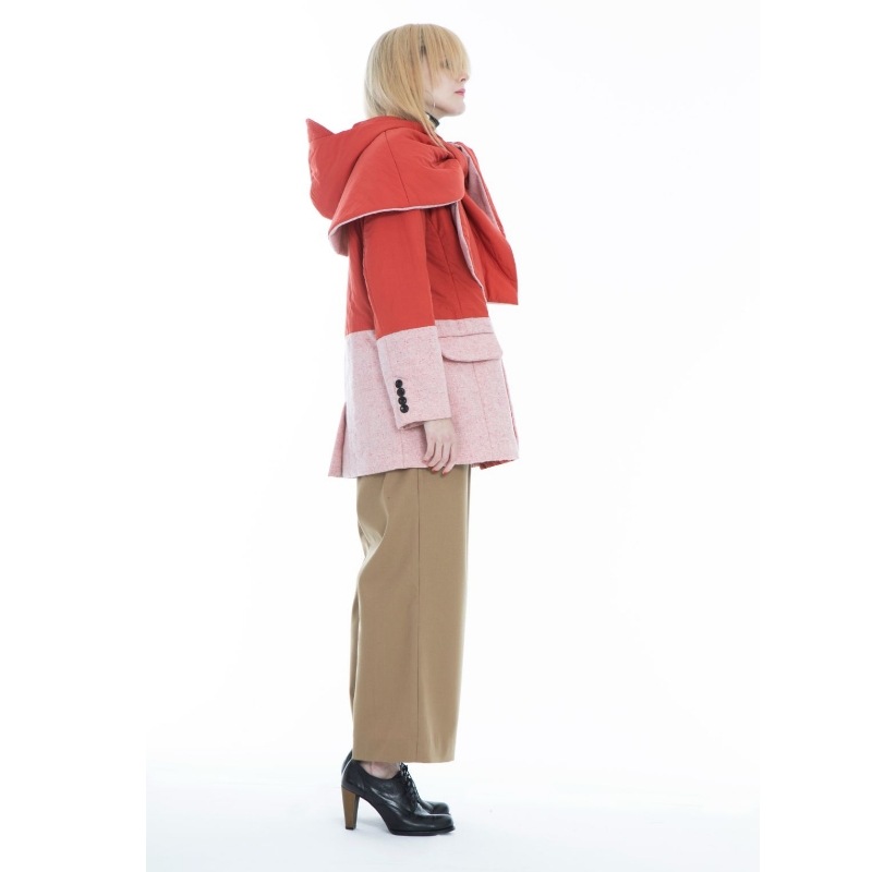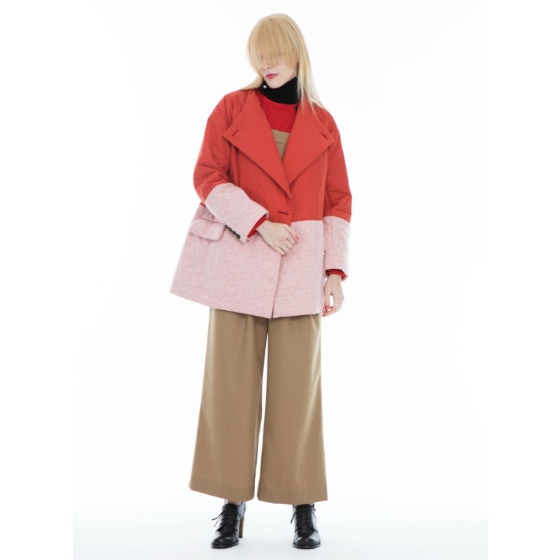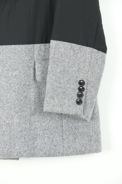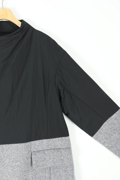 上身頃にタフタ素材を使用し、下身頃をツイード素材に切り替えています。