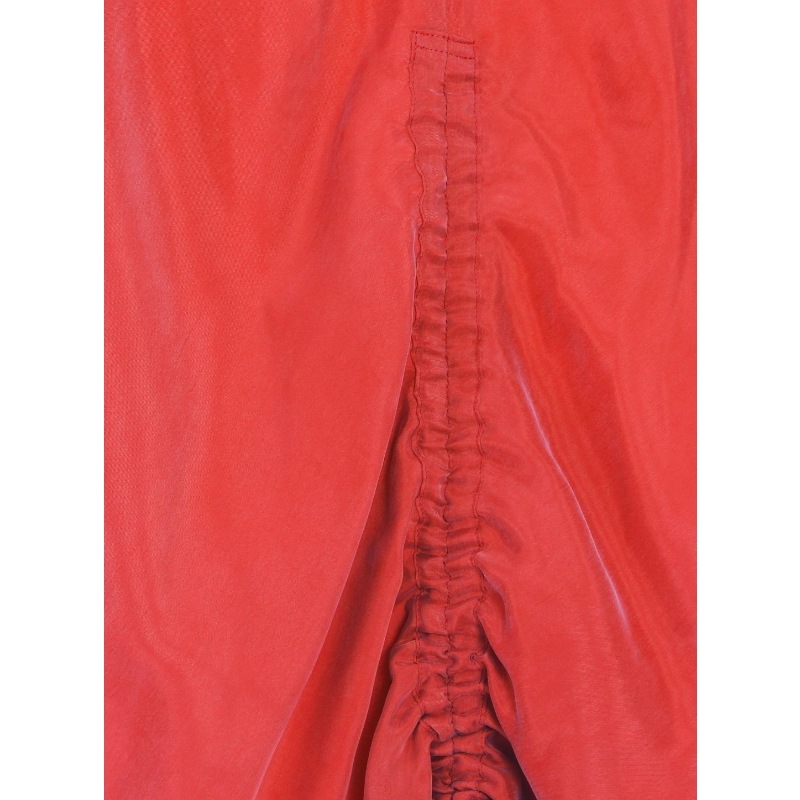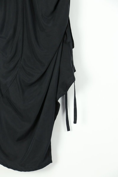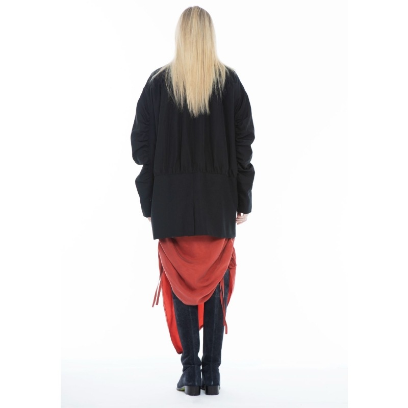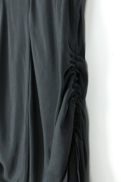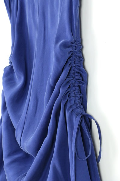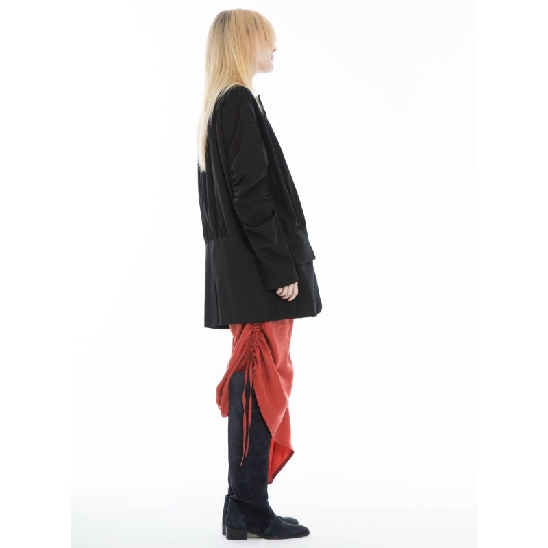 両脇に付けた紐でギャザーを寄せ、シルエットと着丈に変化をつけることができます。