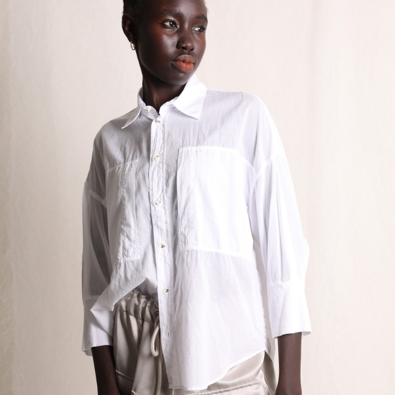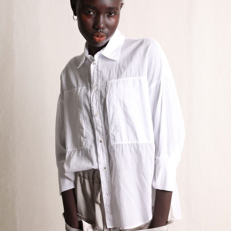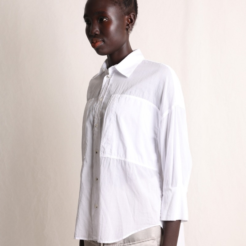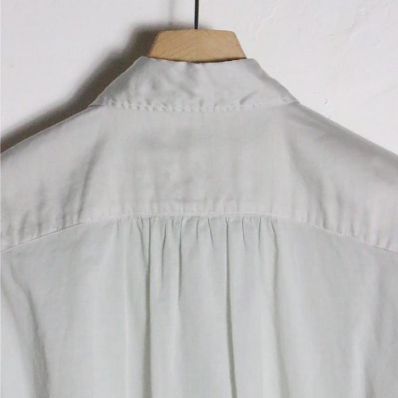 衿と後ろ肩ヨークに自然な光沢感のある80番単糸綿サテンを使用し、袖口には清涼感のある80番単糸綿強撚フライスを使用しており、非常に着心地の良い一枚です。