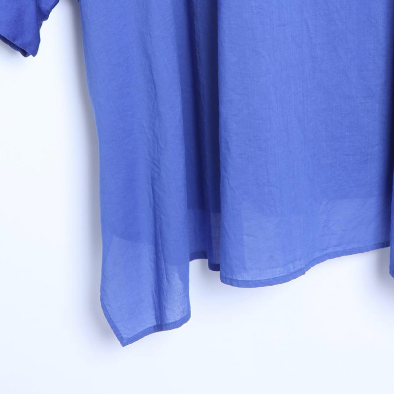 ウエスト下のシャツテール前着丈、ヒップの隠れる後ろ着丈、身頃続きの7分位の袖丈、広巾のカフスが付いています。