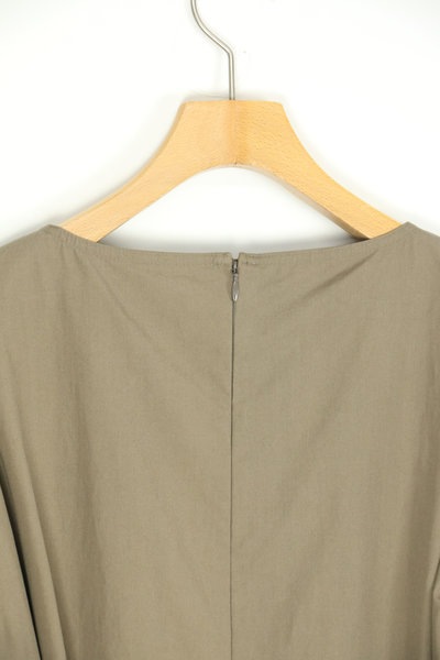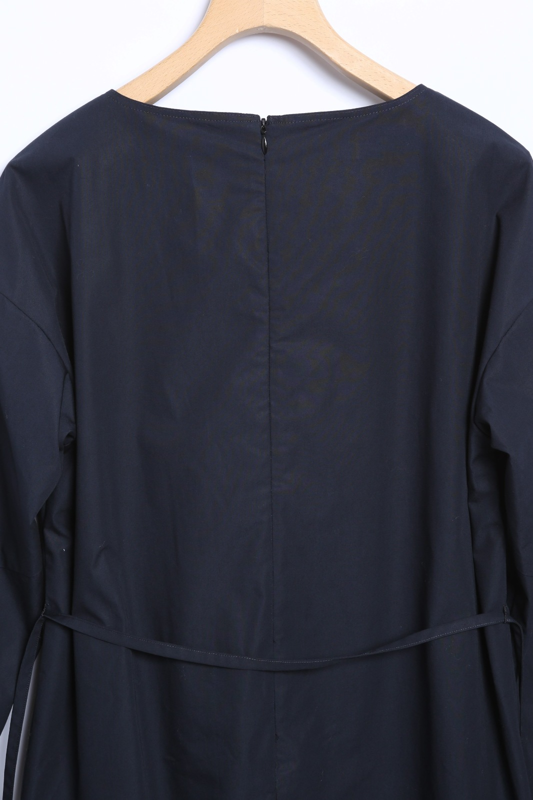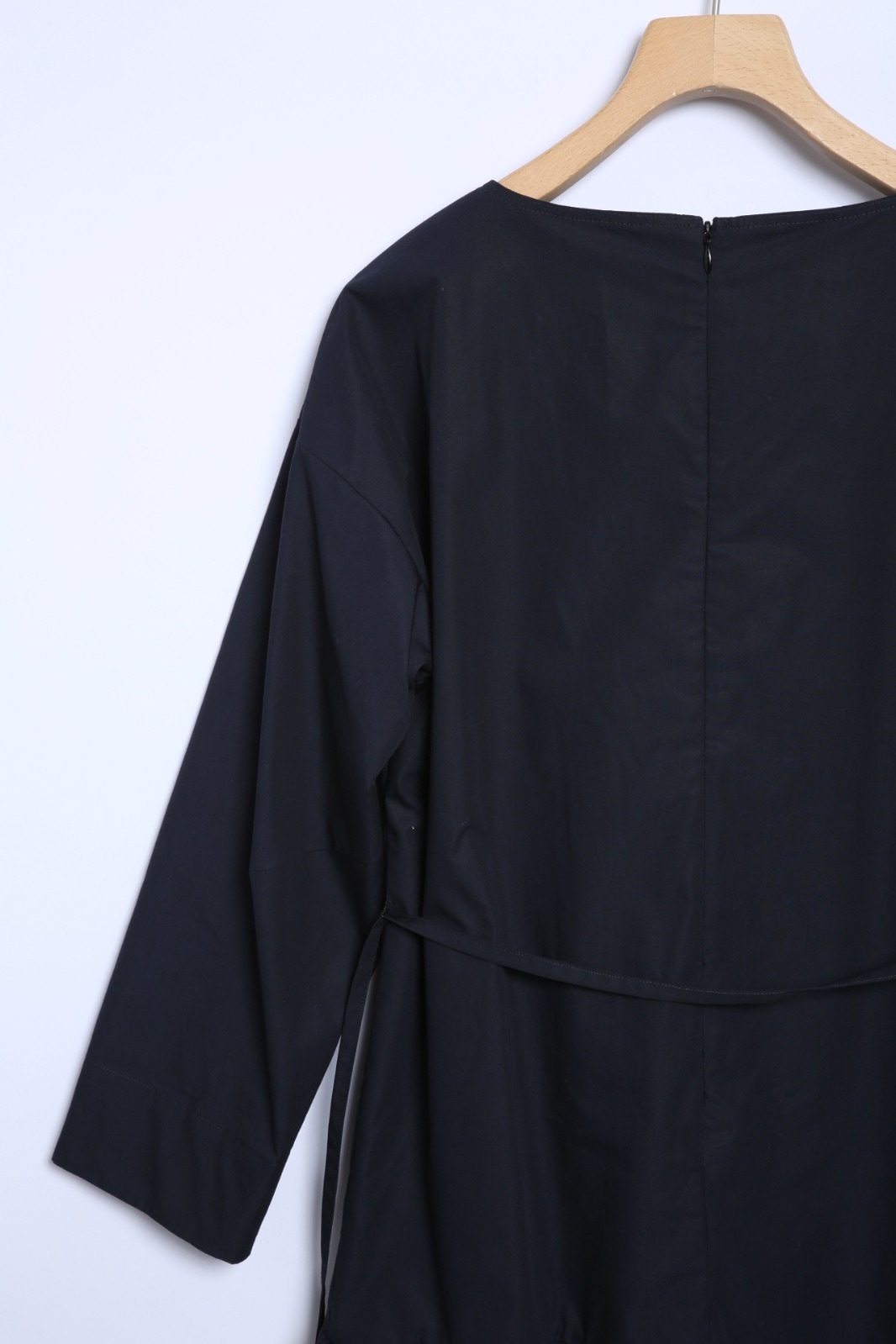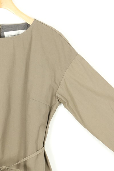 取外し可能な共布の細ベルト付き。後ろ中心コンシールファスナー開き。