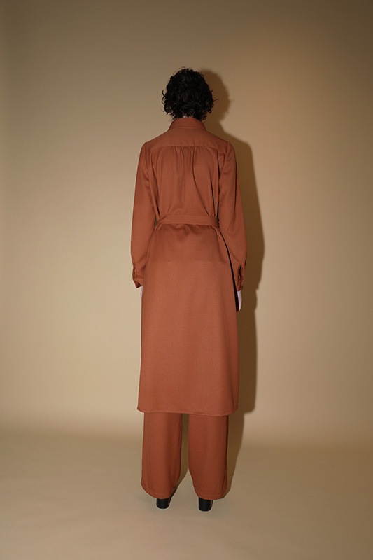 シャキッとしたクールな表情としなやかなドレープ性を併せ持つ上品な素材で、クラシカルかつメンズライクな雰囲気を醸し出します。
