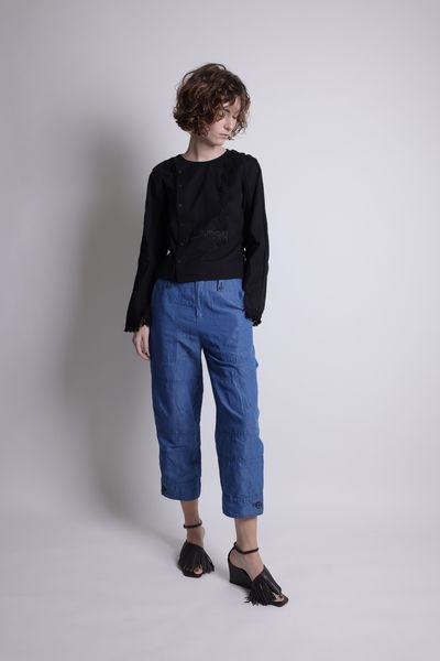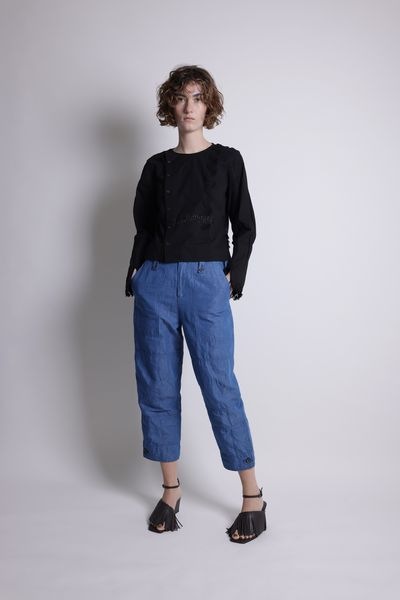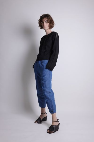 ヒップ上の着丈、程良い身巾、セットインスリーブ、長袖のコンパクトな見た目の前開きブラウス。