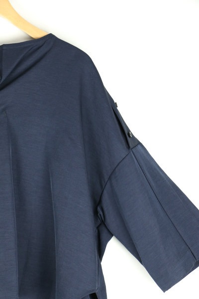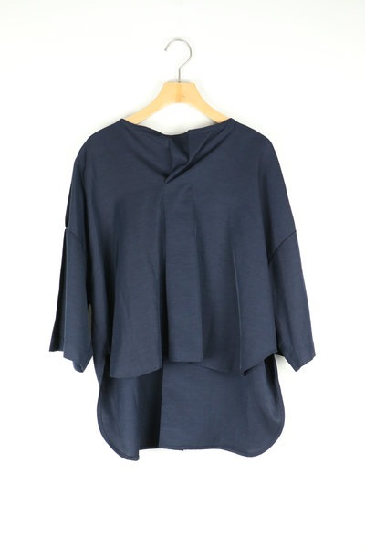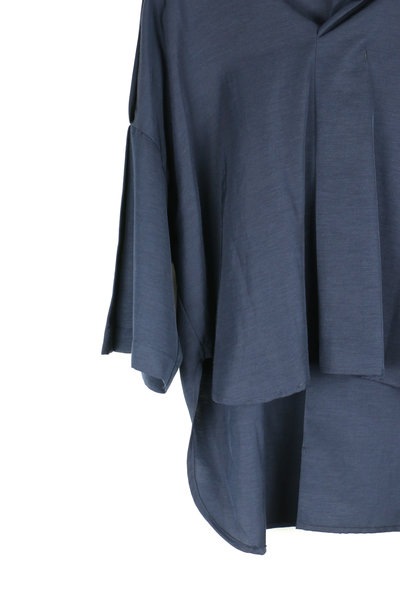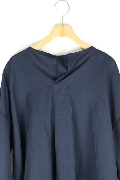 深いプリーツの入った衿ぐりがアクセントとなった被りブラウス。