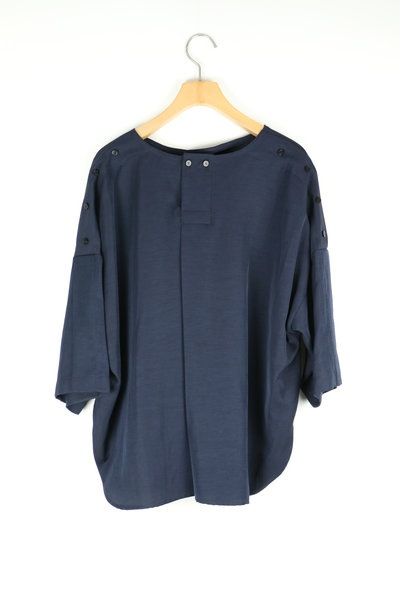 ヒップ中心位の前後差のあるシャツテール着丈、ゆとりのある身巾、ドロップショルダー、5分位の袖丈です。