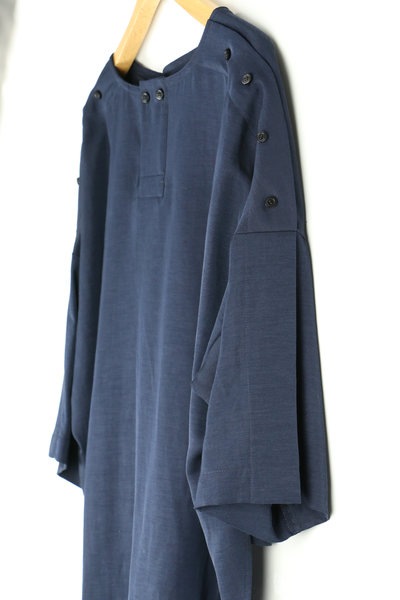 両肩に深いプリーツディテールが肩章のように入り、飾り釦で点止めされ、マニッシュな印象に仕上げています。