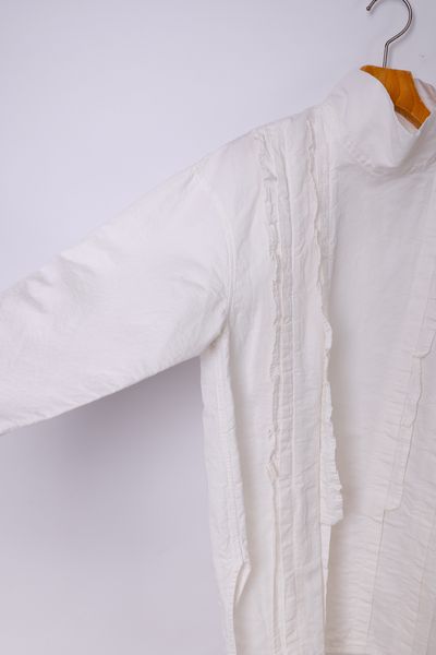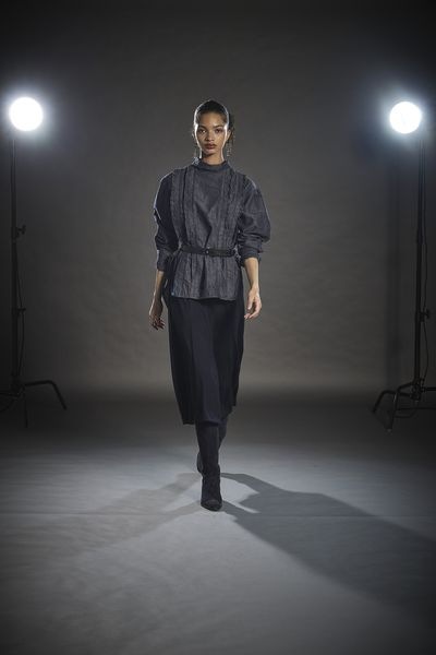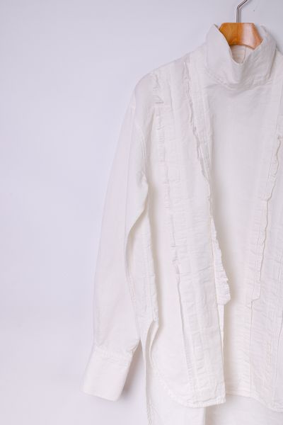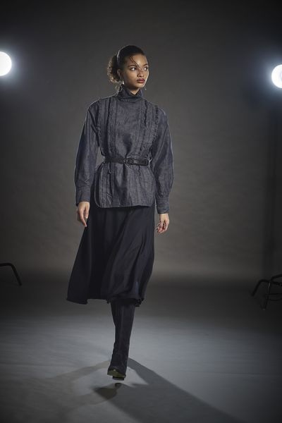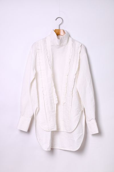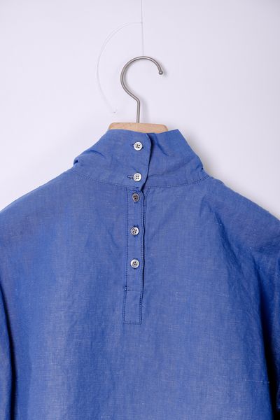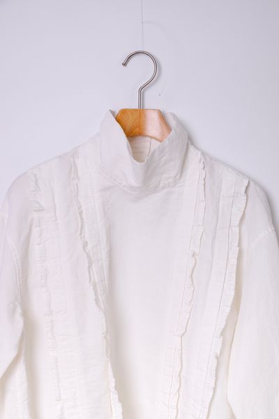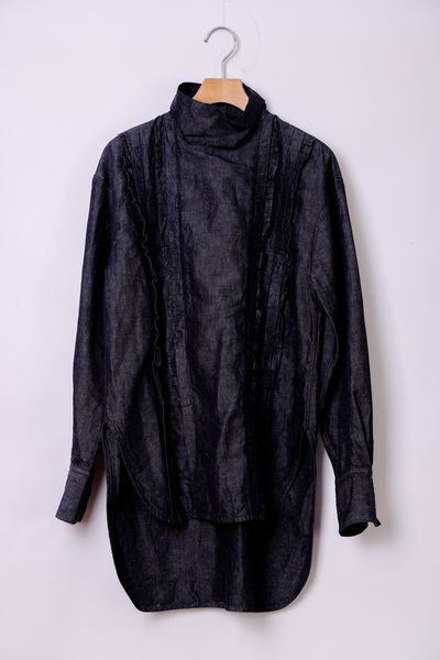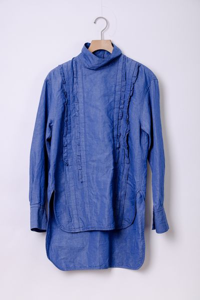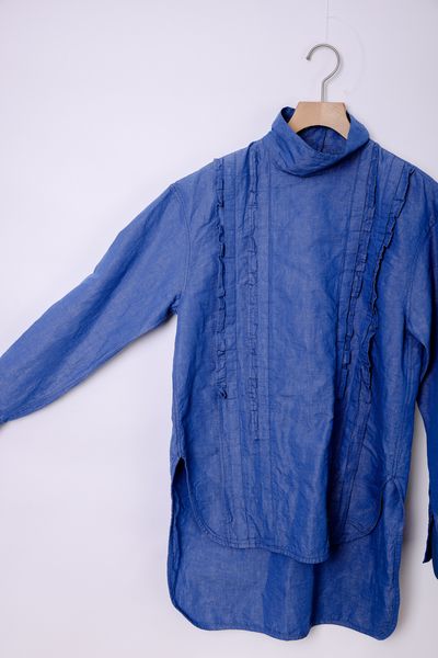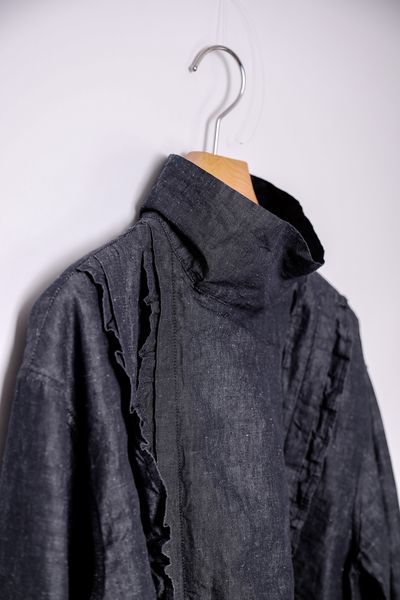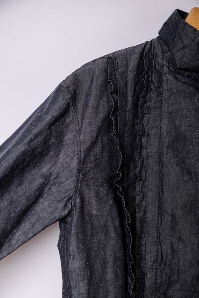 コットンリネンダンガリー スタンドカラーフリルブラウス