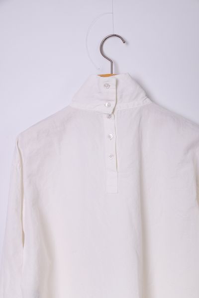 ヒップの隠れる前後差のあるシャツテール着丈の被りチュニックスタンドカラーブラウス。