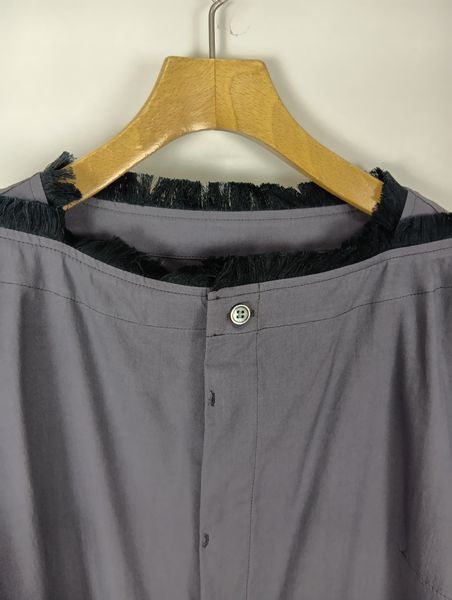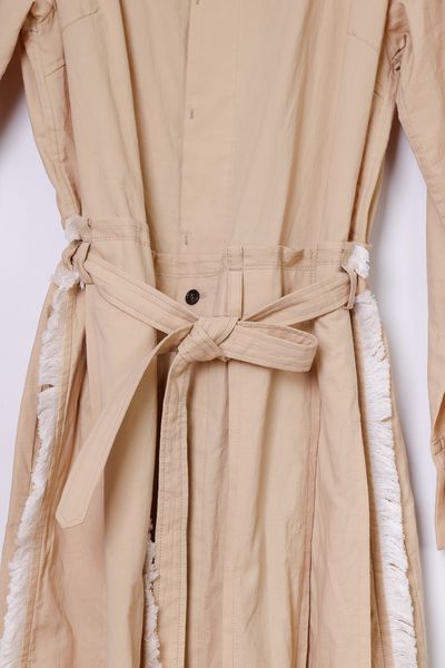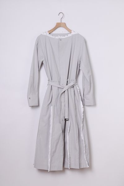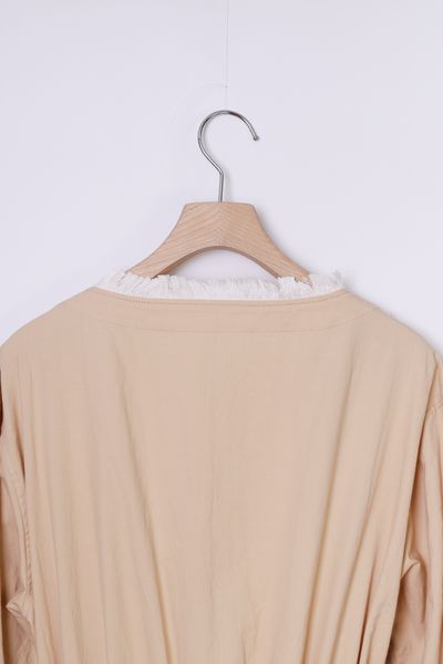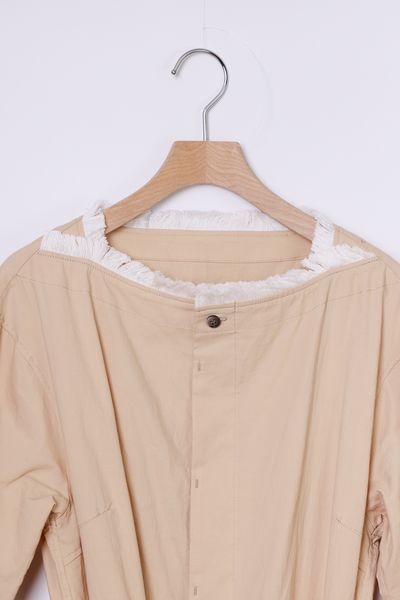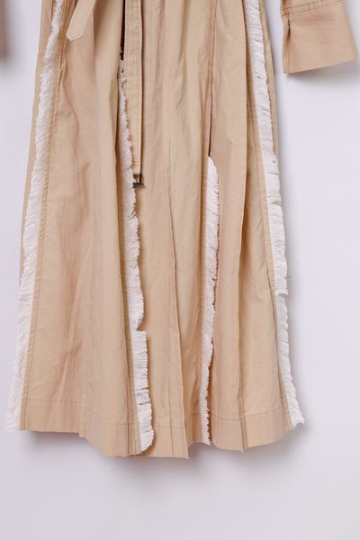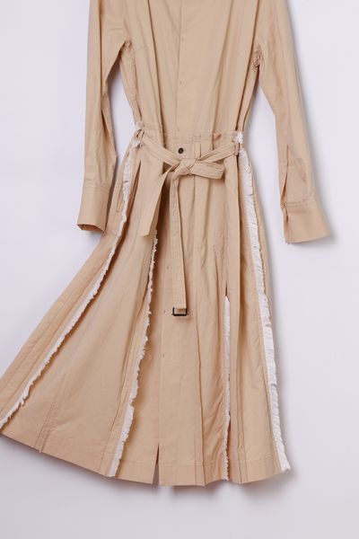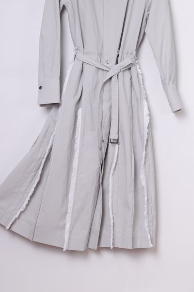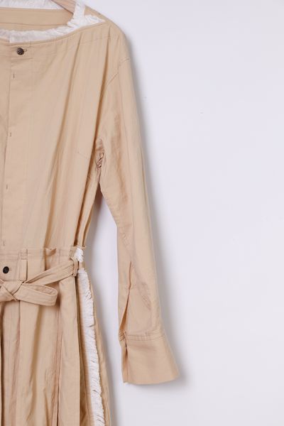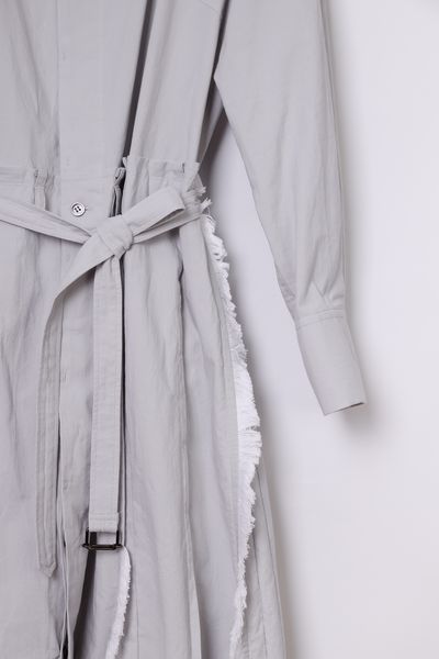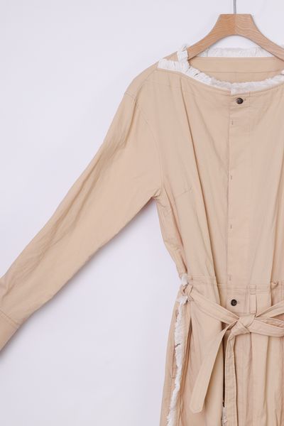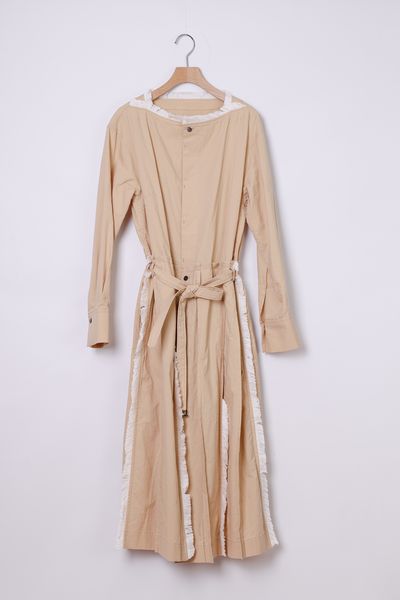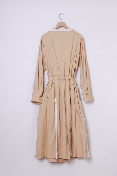 衿ぐり、スカート部分の各所にコットンフリンジを施した前開きボートネックワンピース。