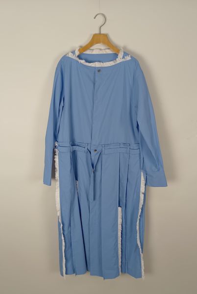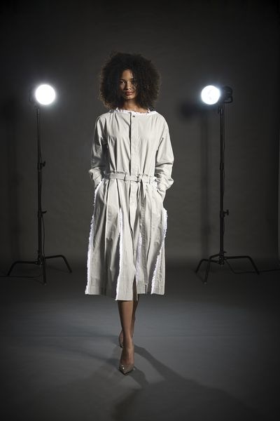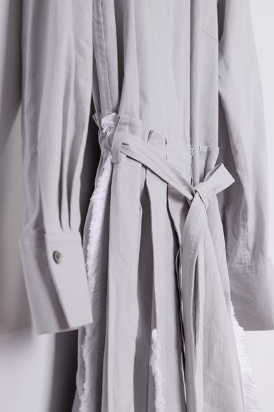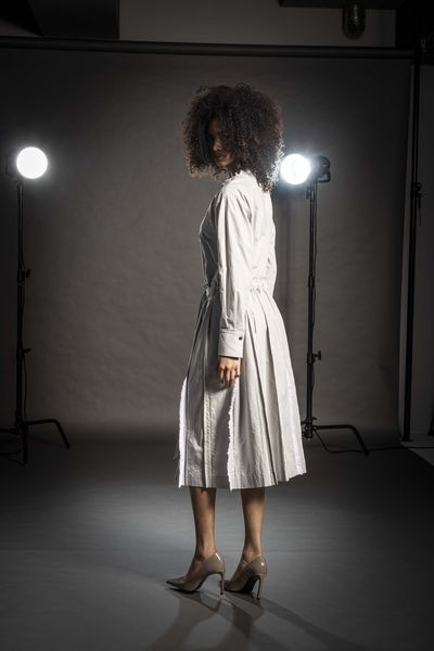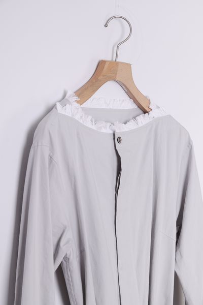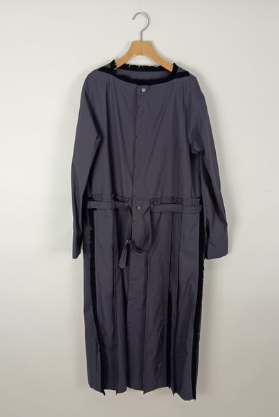 膝下の着丈、Iラインシルエット、やや落ちた肩巾、長袖です。
