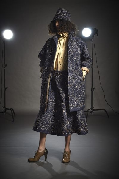 後ろ衿ぐりが特徴的なオープンカラー、コクーンシルエットの膝丈コート。