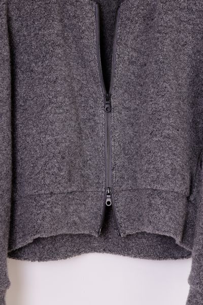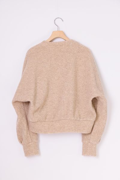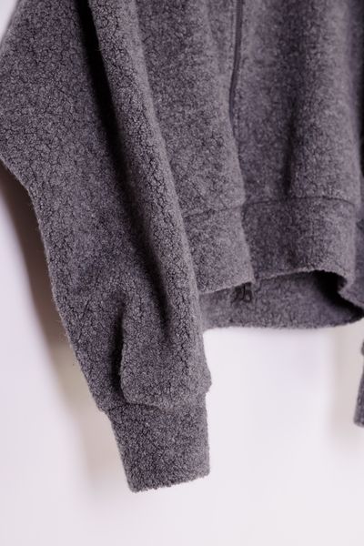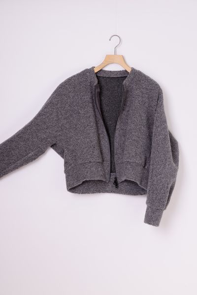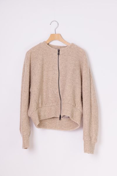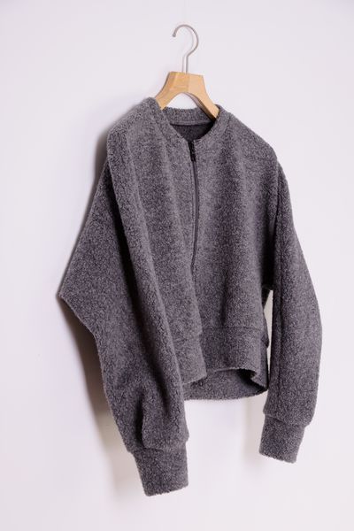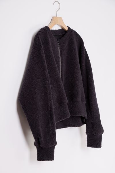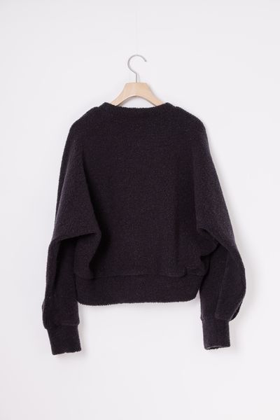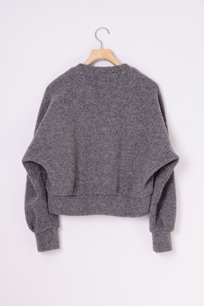 ウエスト位のショートな着丈、ゆとりのある腕周り、身頃から続いた長袖です。