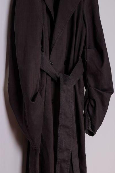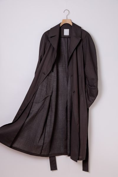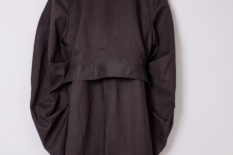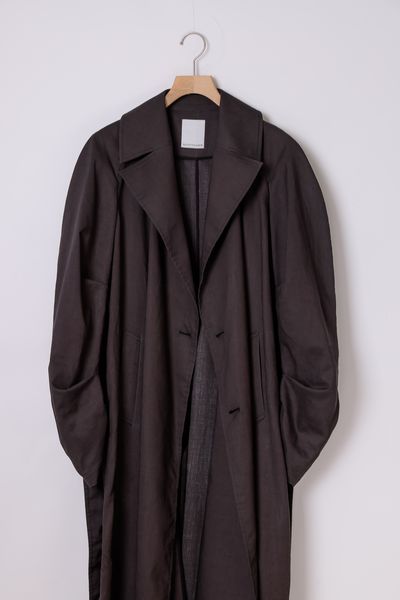 タックを施した袖の膨らみが特徴的なトレンチコートです。