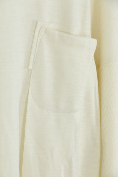 ヒップの隠れる着丈、程良い身巾、ドロップショルダー、別布テレコの袖下マチが付いています。