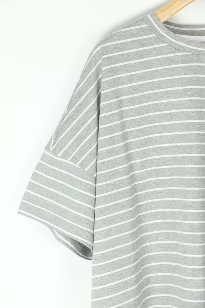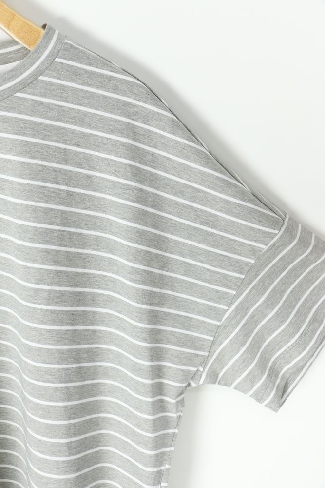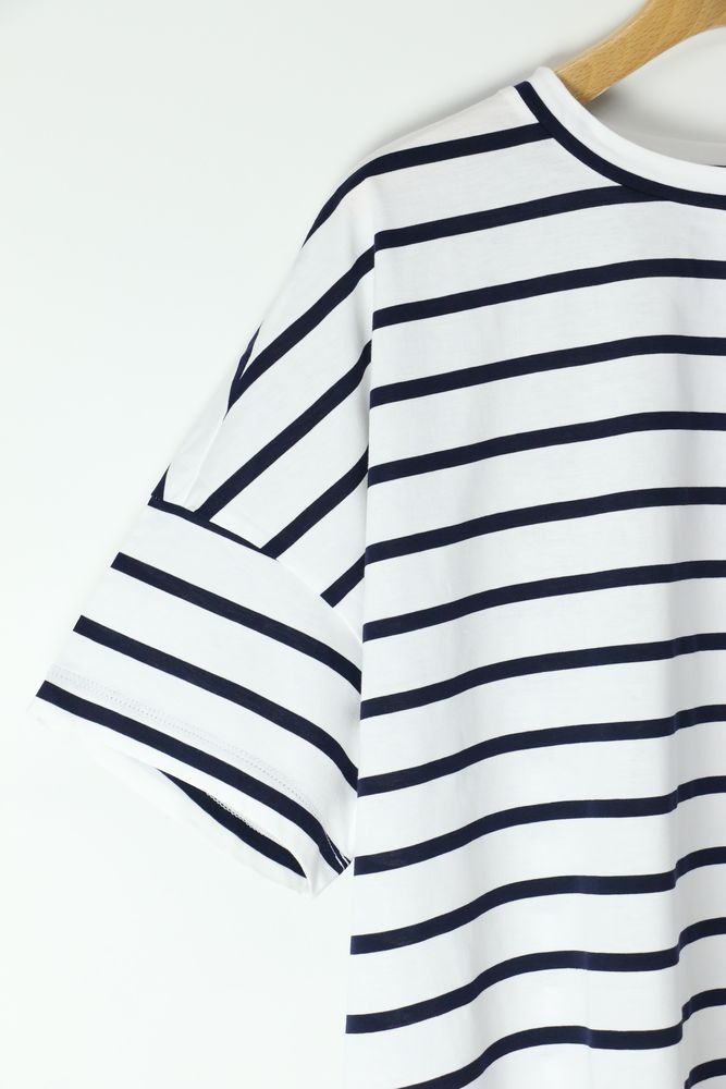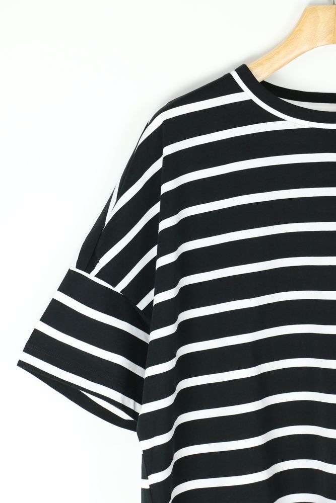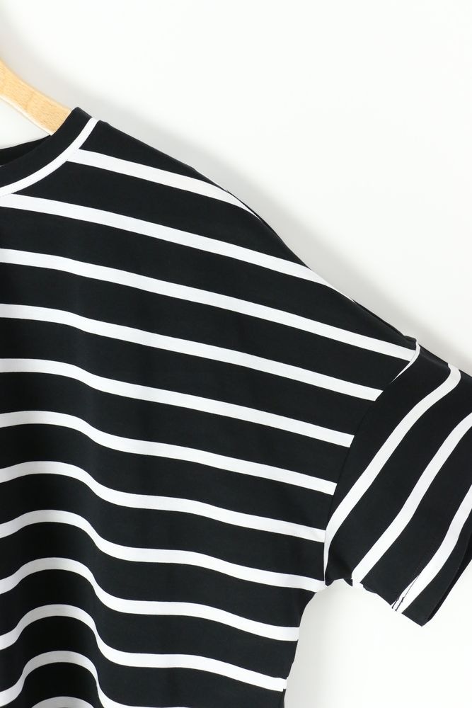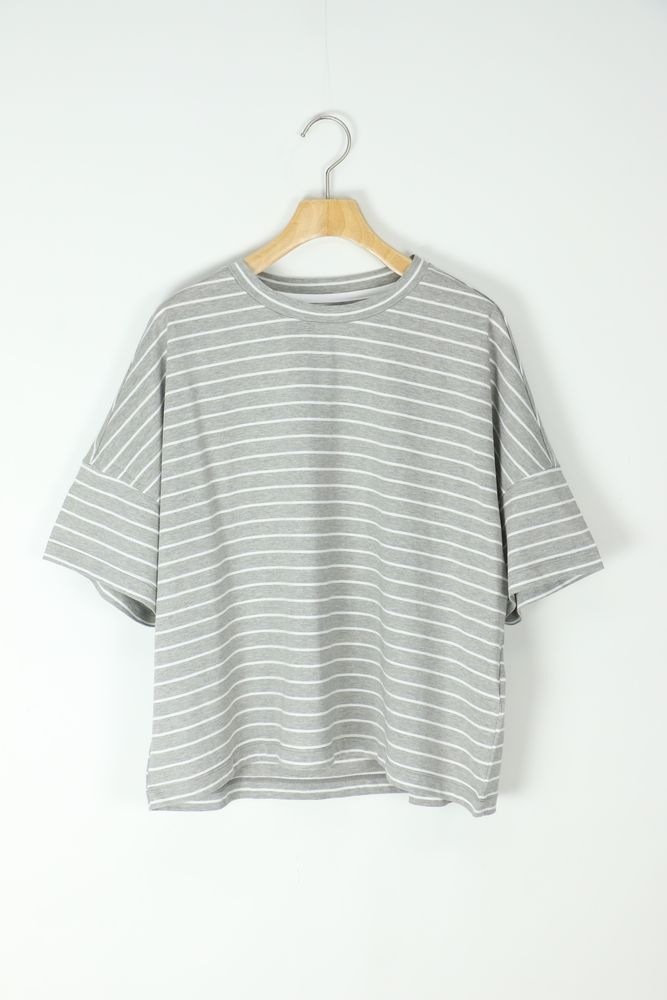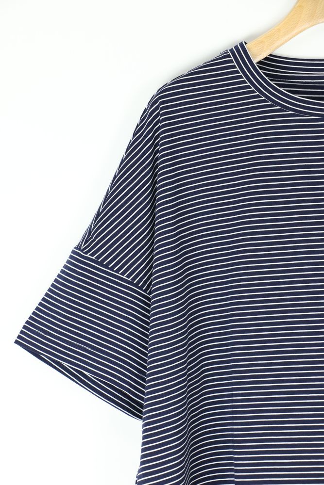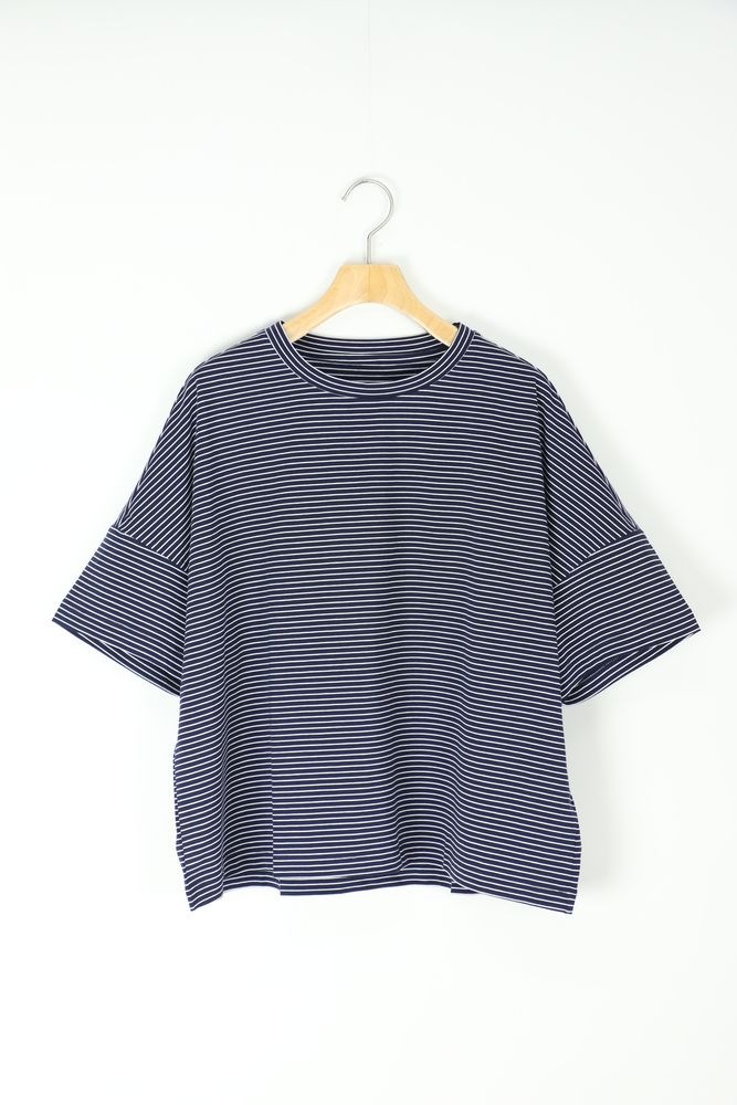 ヒップ上の着丈、ゆとりのある身巾、肘の見えるキャップスリーブの半袖です。